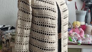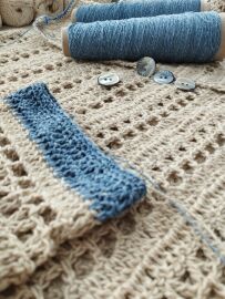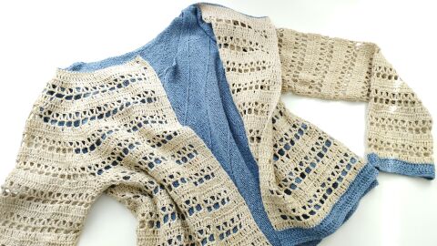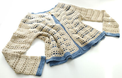 Velikost S. Oproti návodu jsem tělo háčkovala rovně bez ujímání. Rukávy jsem háčkovala v lícových a rubových řadách, abych zachovala rovný šev.
