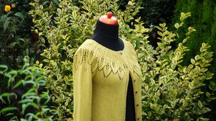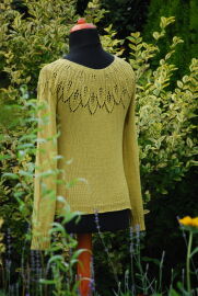 "Propínací svetr s krátkým rukávem a kruhovým sedlem s lístkovým a ažurovým vzorem pletený shora dolů. Já budu plést s dlouhým rukávem :)"