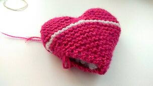 Srdíčka sešijeme k sobě, cca 5 cm před koncem vycpeme a zbytek sešijeme. Mezi obloučky můžeme protáhnout stužku nebo provázek na zavěšení.