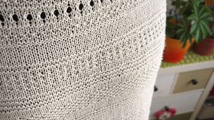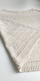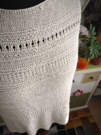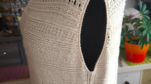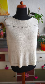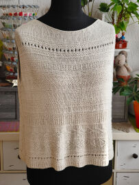 "Top je pletený odshora dolů. Na výstřih jsem použila zkrácené řady, vzory jsem vymýšlela v průběhu pletení 😊"